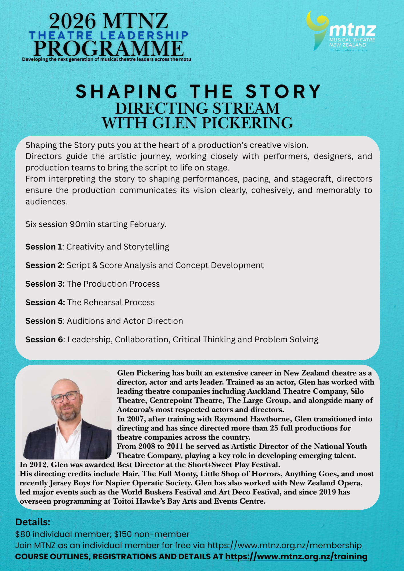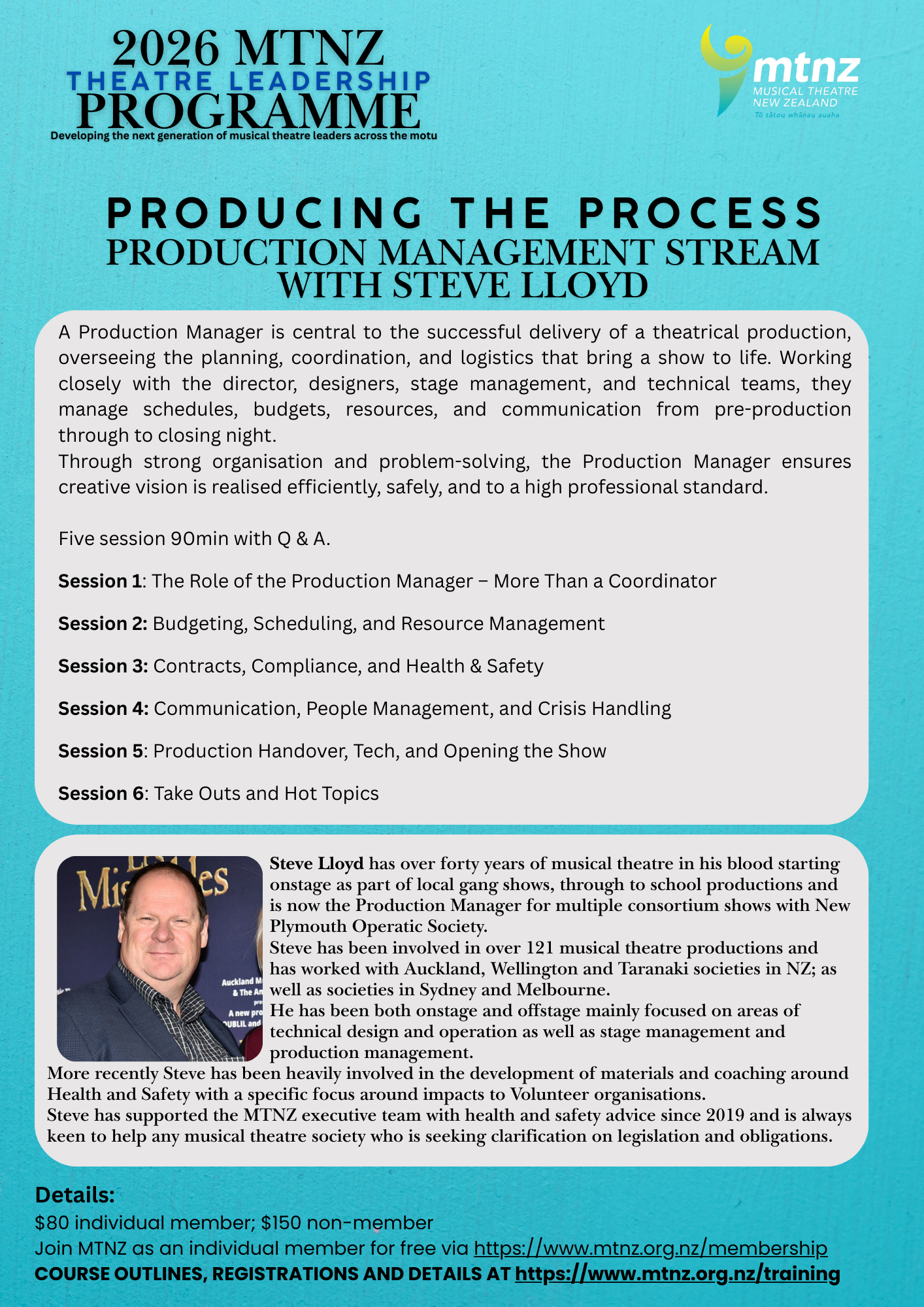 The MTNZ Theatre Leadership Programme is a six-month online initiative designed to build capability in New Zealand’s community musical theatre sector. Across two specialist streams—Producing the Process (Production Management) and Shaping the Story (Directing)—participants engage in six focused 90-minute sessions, each with time for discussion and Q&A, supporting confident and effective theatre leadership across Aotearoa.